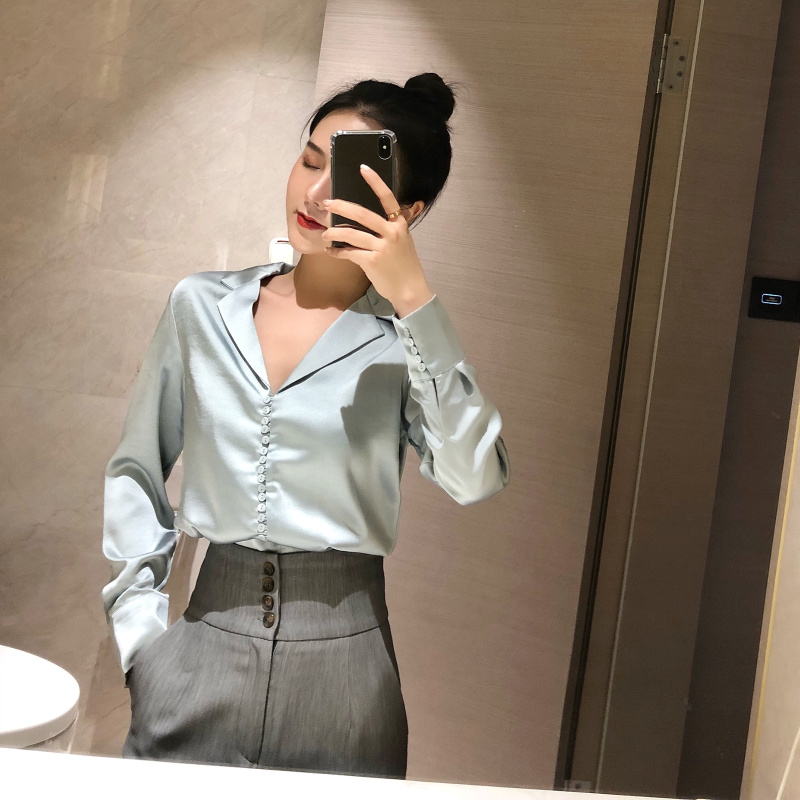 / 早秋緞面襯衫女秋裝上衣心機襯衣卷邊哈倫褲小腳休閑九分褲套裝潮