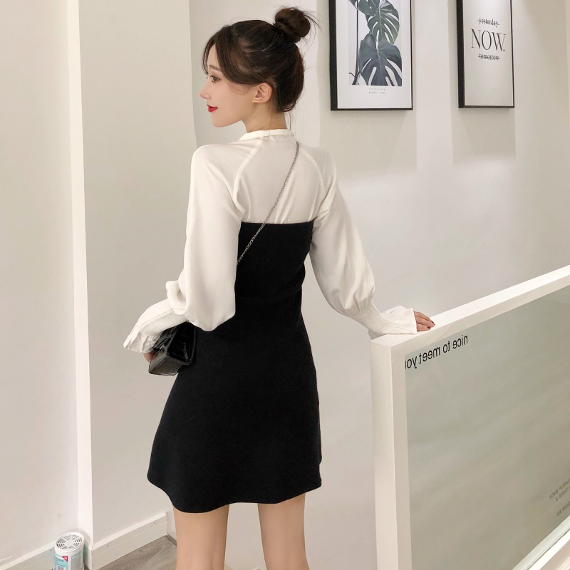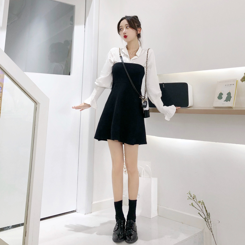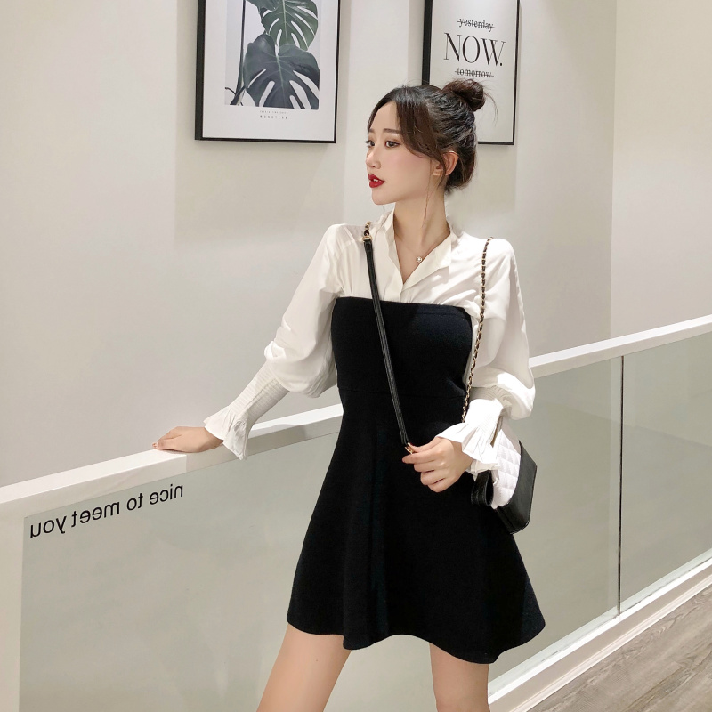 這是一款白襯衫和抹胸裙搭配的一套