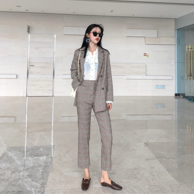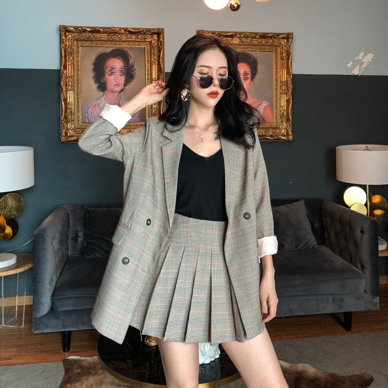 / 新款女格子西裝外套高腰百褶半身裙九分褲西褲三件套港風時尚套裝