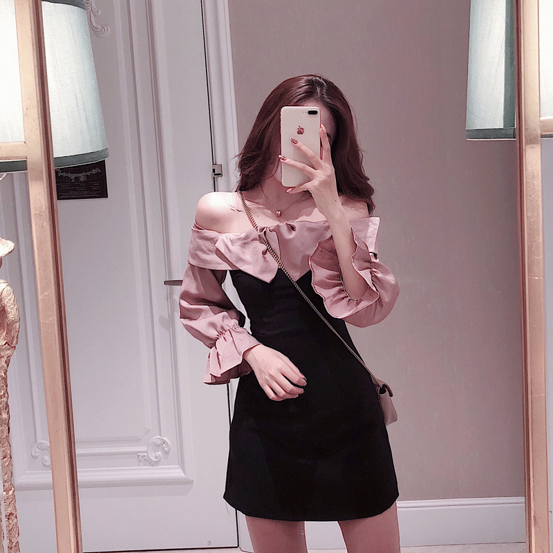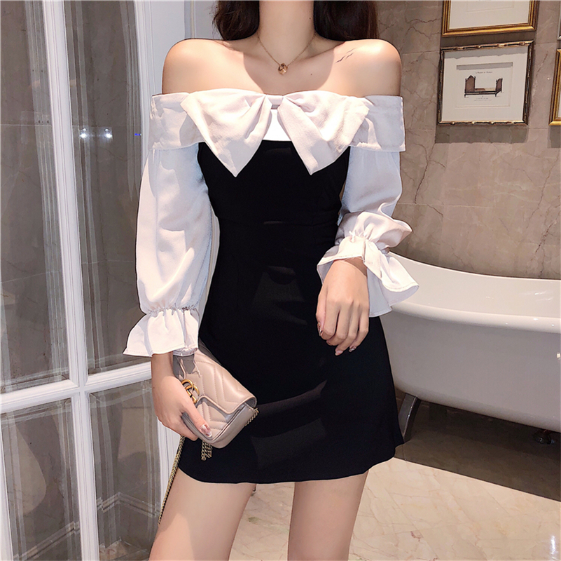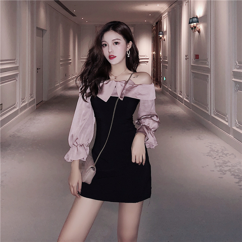 / 洋氣時尚新款秋季韓版百搭短裙修身蝴蝶結露肩撞色拼接顯瘦連衣裙
