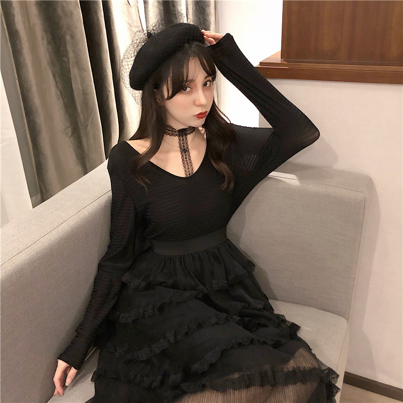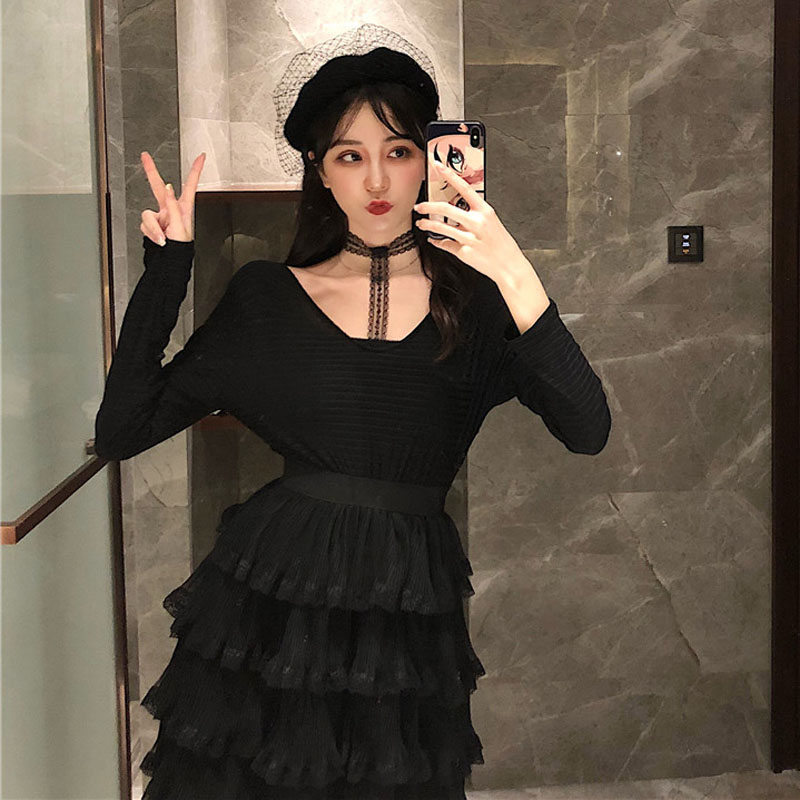 / 2018秋冬港味新款時尚V領打底蛋糕裙網紗蕾絲黑色中長款連衣裙女