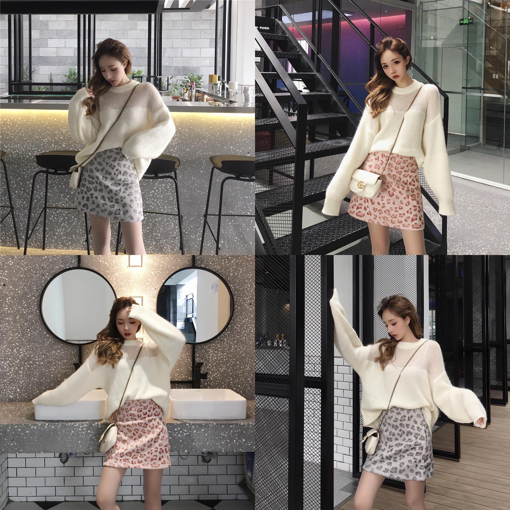 秋裝女2018新款套裝chic豹紋長袖毛衣+韓版百搭高腰A字半身裙皮裙