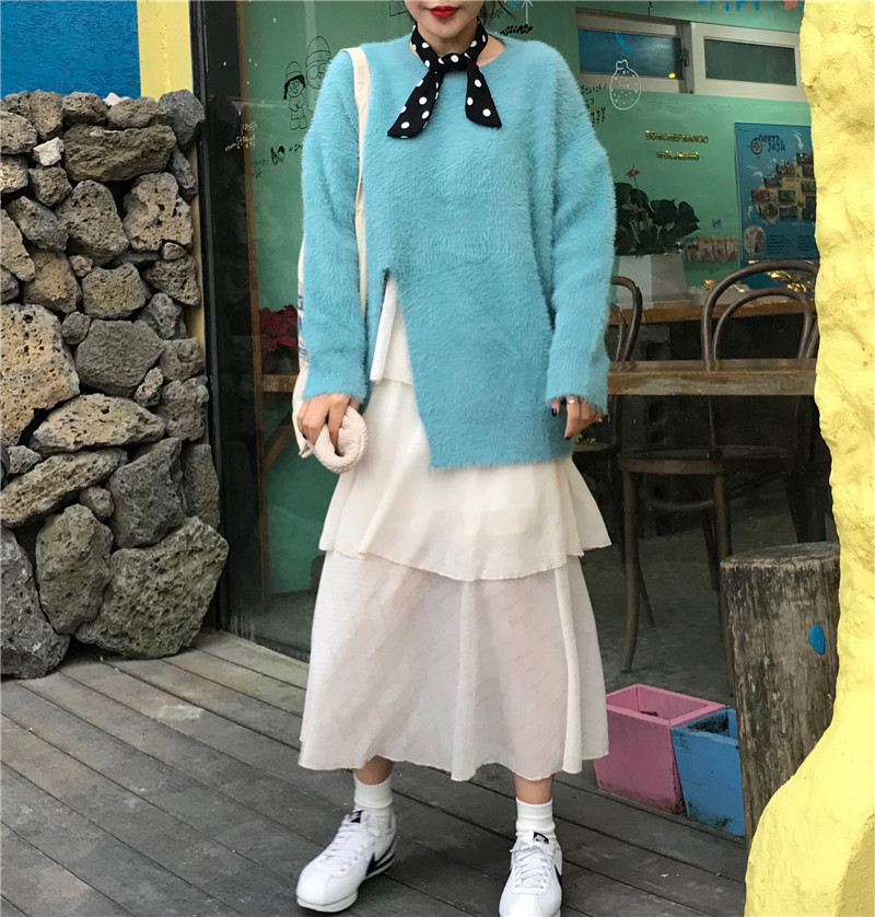 時尚慵懶風套頭毛衣女2018新款秋冬韓版氣質百搭開叉寬松針織上衣