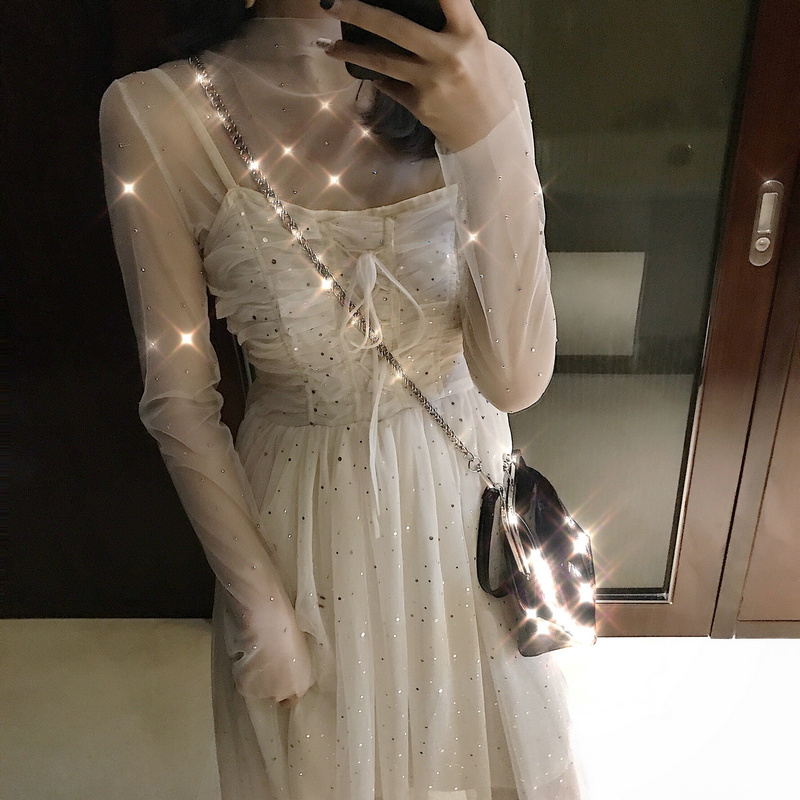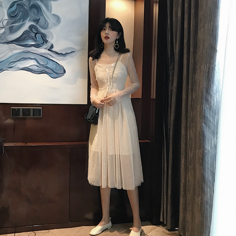 早秋兩件套裙女氣質網紗上衣亮片網紗裙韓版時尚套裝2018新款女裝