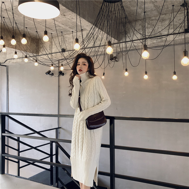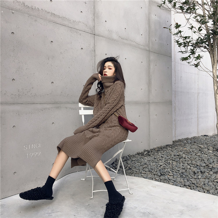 復古網紅毛衣女2018新款秋冬長款高領寬松加厚百搭慵懶坑條毛衣裙