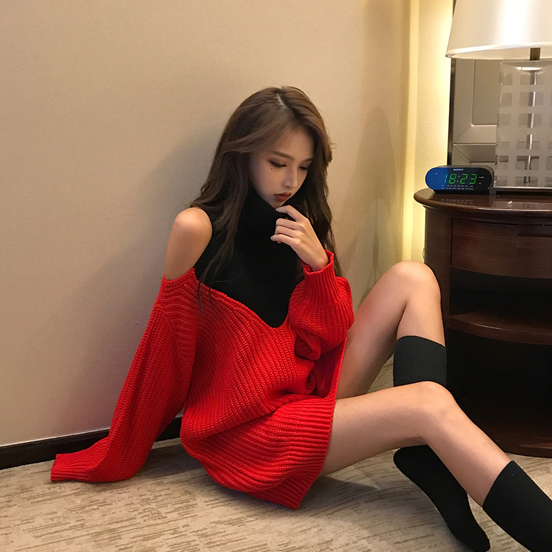 復古chic新款假兩件小心機露肩設計感上衣長袖寬松中長款百搭毛衣