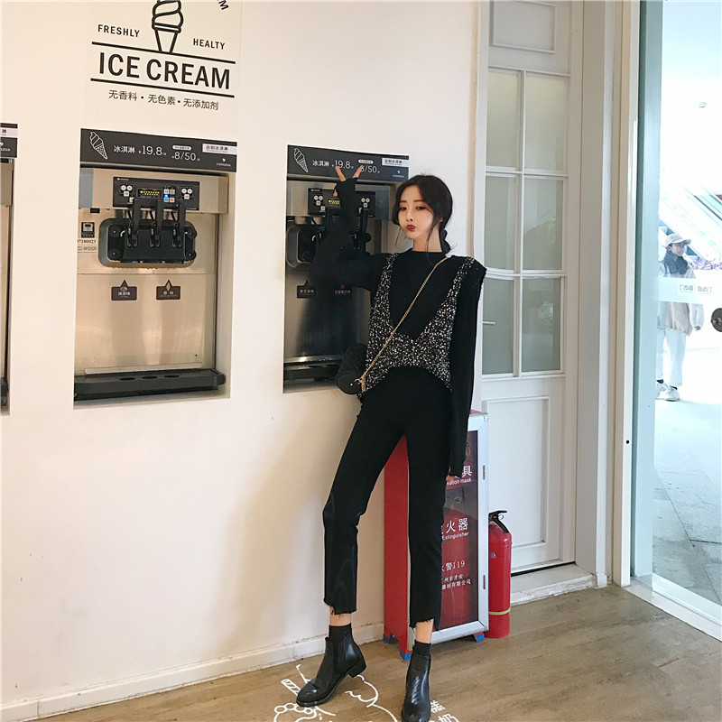 / 慵懶寬松閃閃拼接馬甲時尚套裝高腰顯瘦不規則微喇叭牛仔褲兩件套