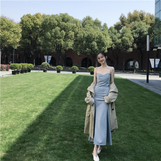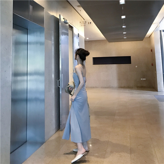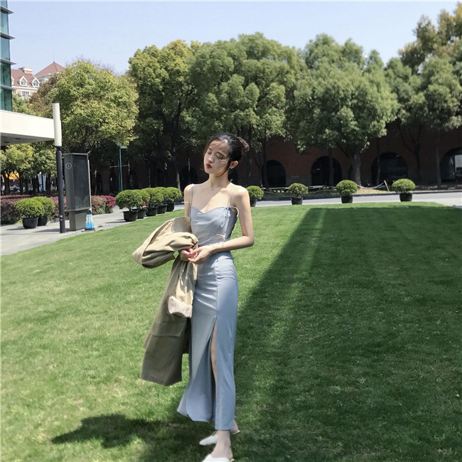 / 韓版2018新款連衣裙復古chic修身顯瘦純色百搭開叉時尚吊帶長裙女