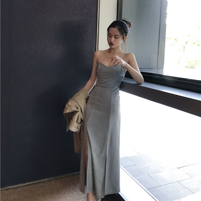 韓版2018新款連衣裙復古chic修身顯瘦純色百搭開叉時尚吊帶長裙女