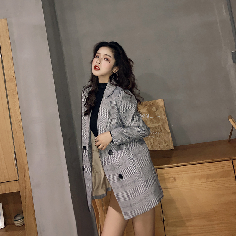 / 港味小香風時尚百搭復古格子西裝女秋裝新款中長款休閑氣質外套潮