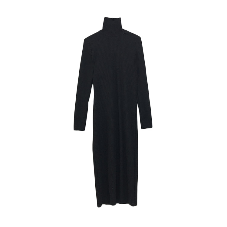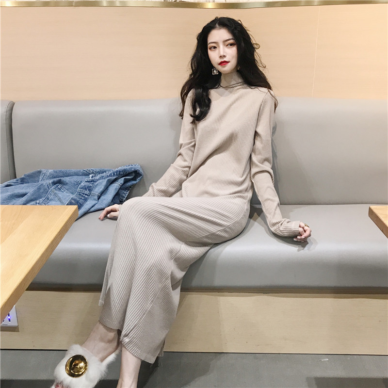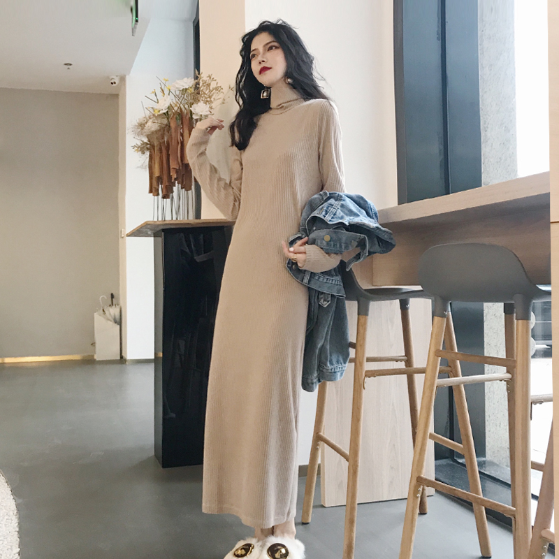 韓版女裝秋冬2018新款女裙子過膝顯瘦后開叉高領打底長裙連衣裙女