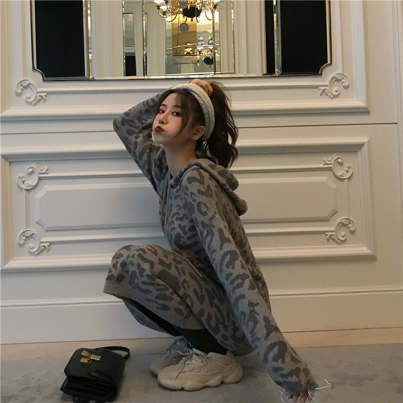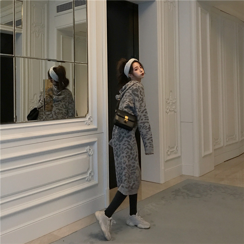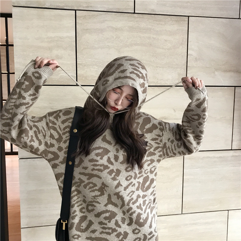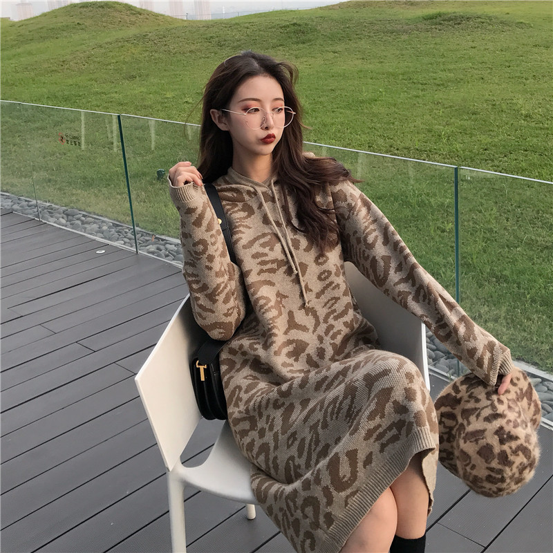 / 新款復古chic時尚秋冬中長裙豹紋慵懶過膝寬松連帽針織毛衣連衣裙