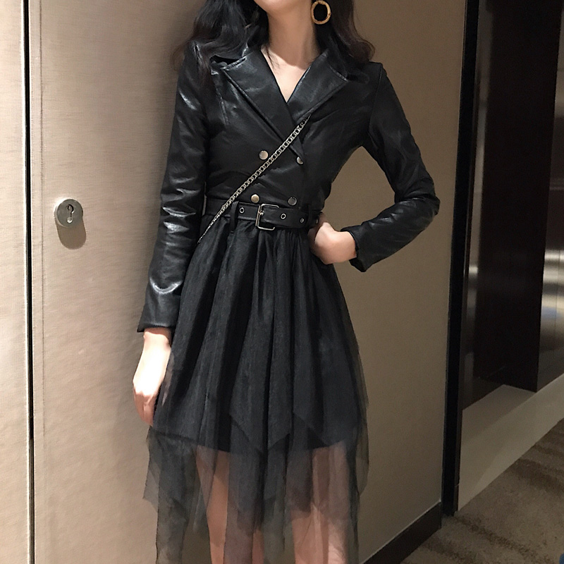 2018新款時尚港味氣質女人味外套皮衣拼接網紗假兩件連衣裙秋裝女