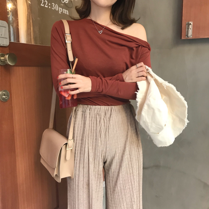 / 早秋純色修身氣質斜領露鎖骨小心機性感百搭港味復古一字肩上衣女