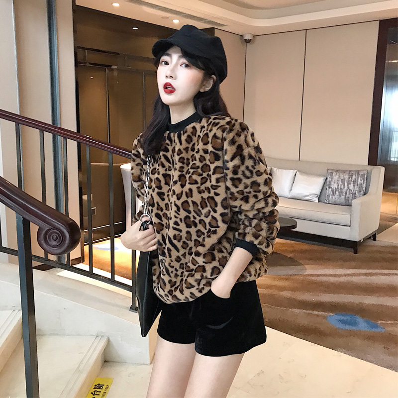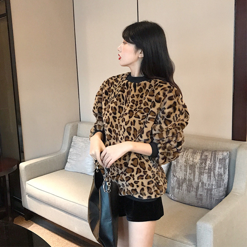 港味復古新款韓版豹紋毛毛衛衣女寬松時尚chic燈籠袖圓領上衣潮