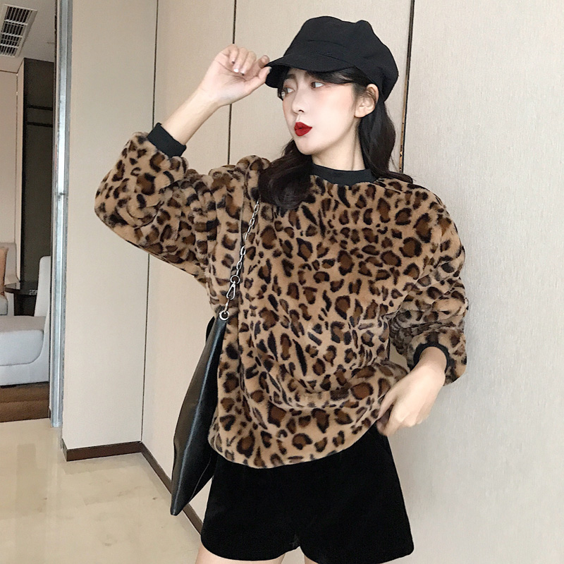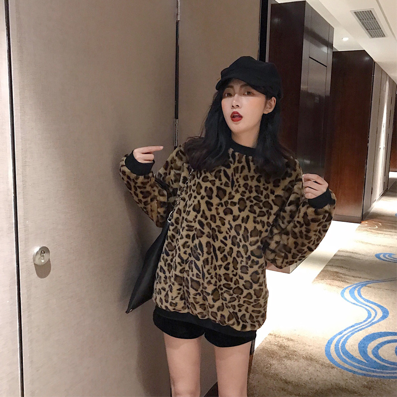 / 港味復古新款韓版豹紋毛毛衛衣女寬松時尚chic燈籠袖圓領上衣潮