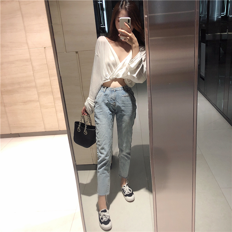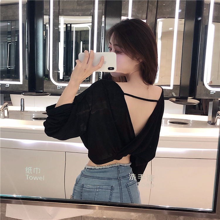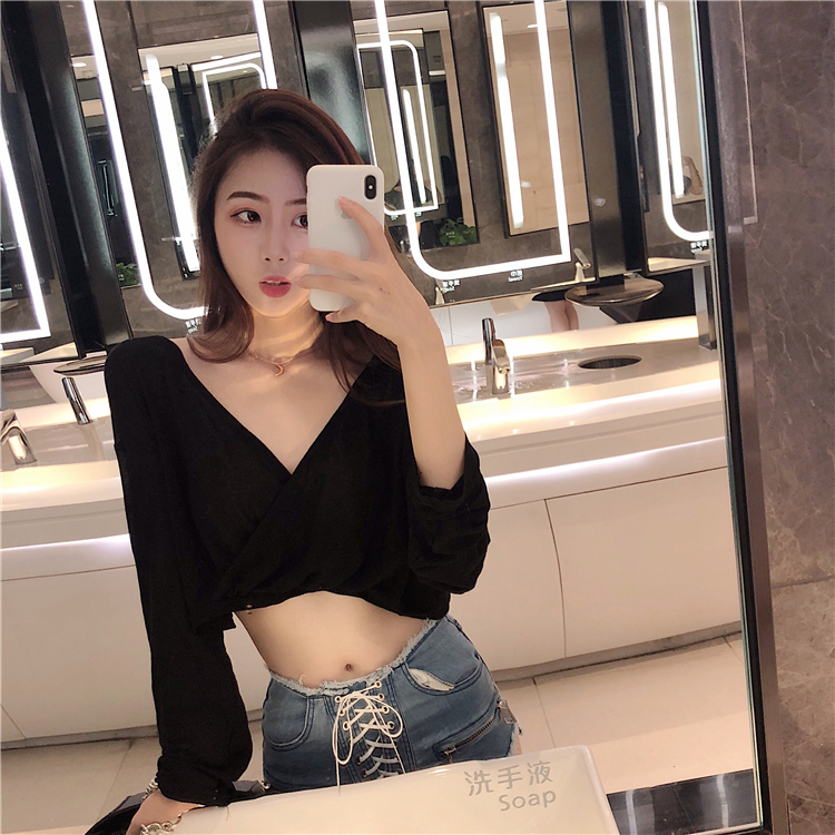 2018新款短款小心機性感打底衫大V領露背T恤長袖防曬衫女港味上衣