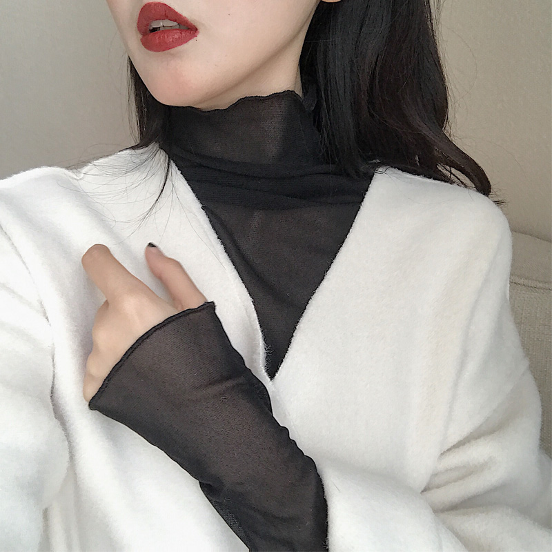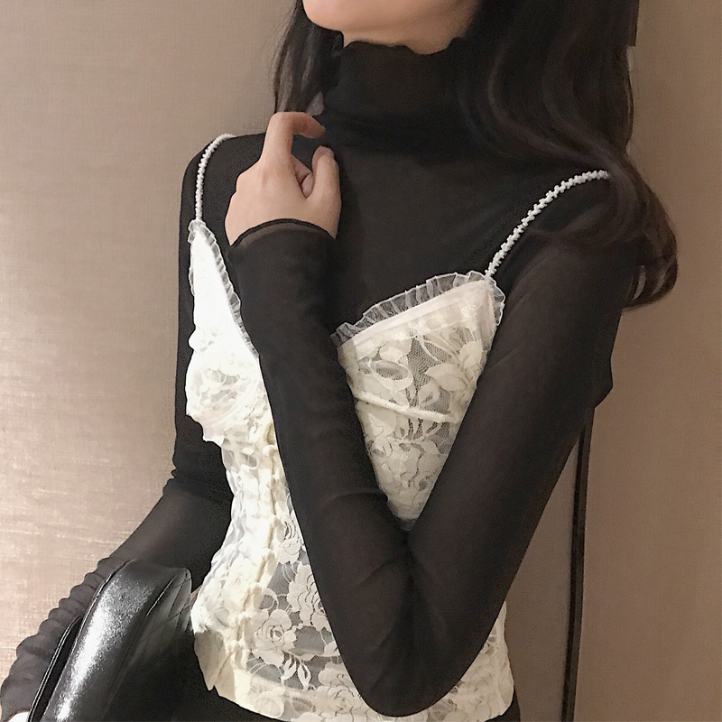 復古韓國chic風性感透視蕾絲鏤空高領顯瘦透視網紗喇叭袖內搭上衣