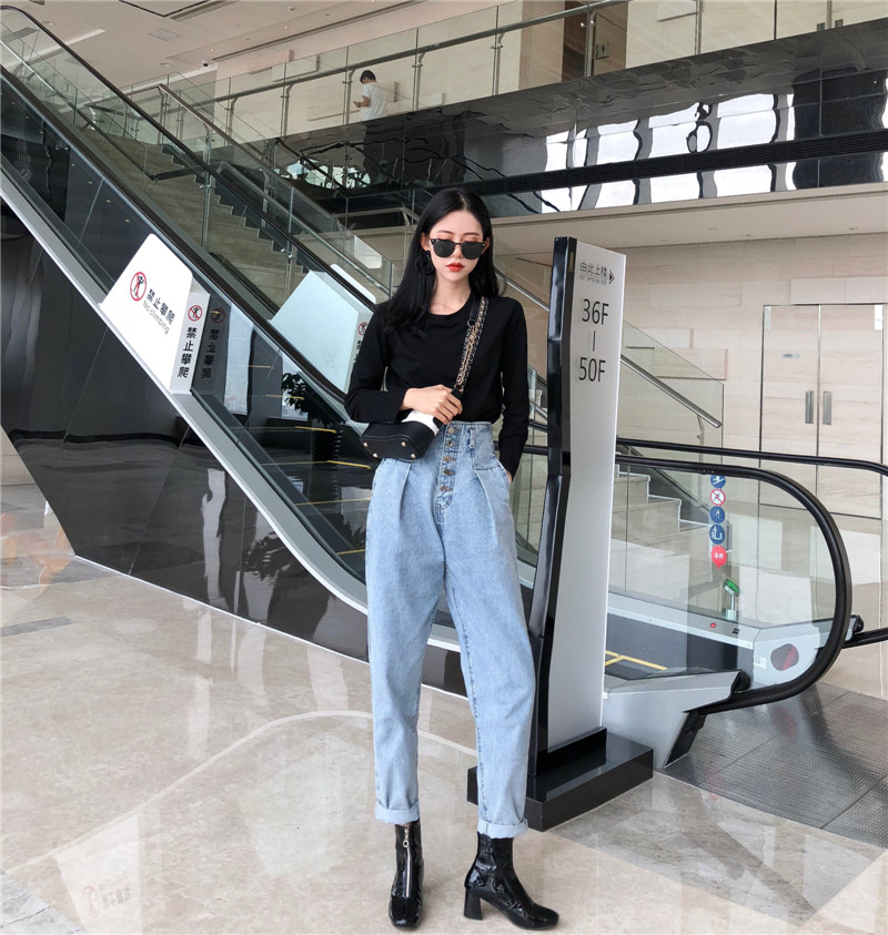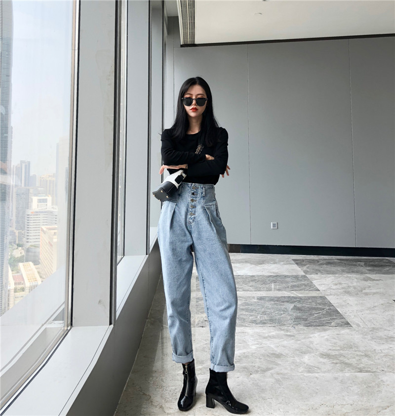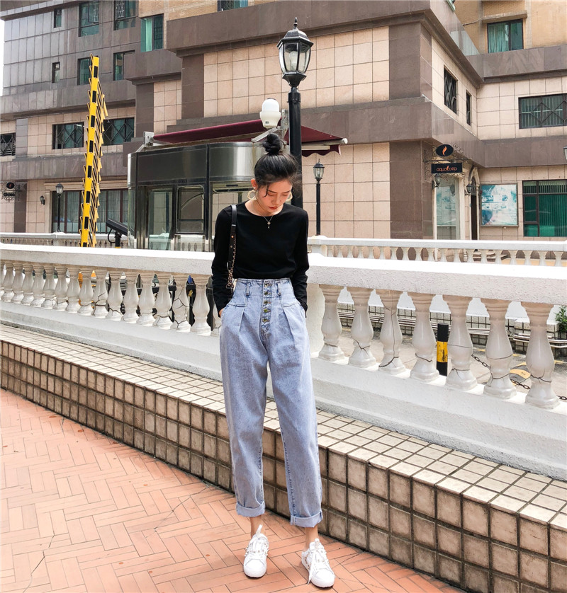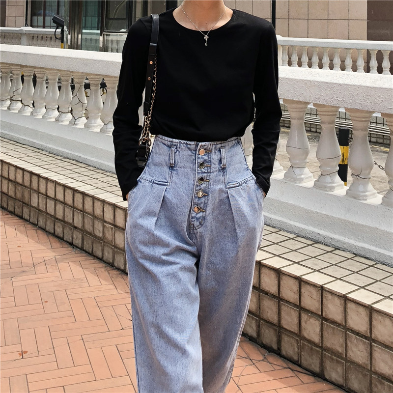 褲子女2018新款韓版單排扣復古高腰直筒牛仔褲時尚百搭顯瘦九分褲