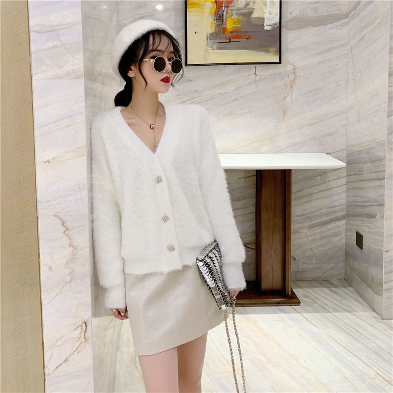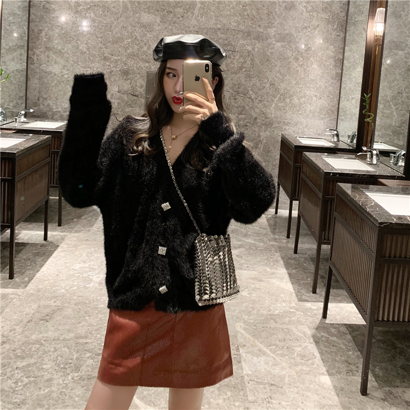chic秋裝女2018新款慵懶風網紅毛衣外套女鉆扣開衫+豹紋短裙套裝