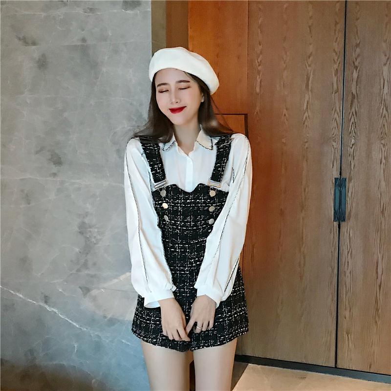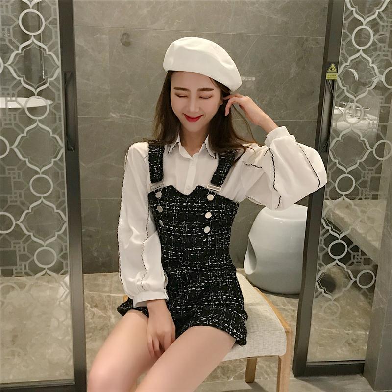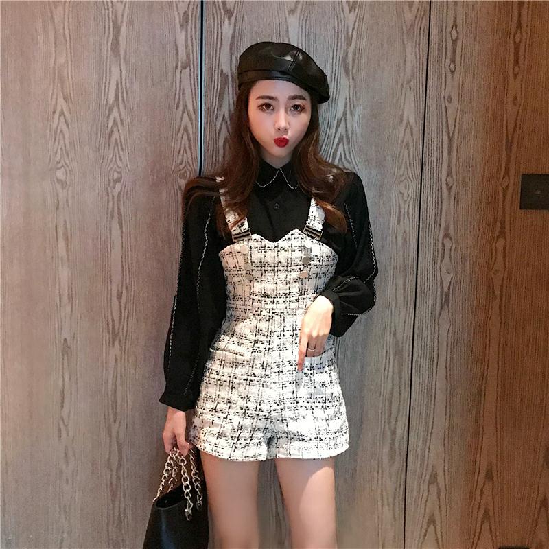 / 秋裝新款韓版時尚套裝chic顯瘦長袖襯衣氣質背帶連體褲毛呢短褲女