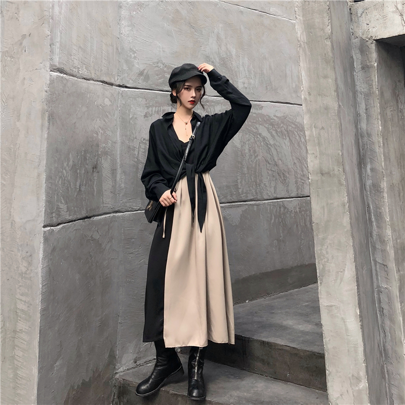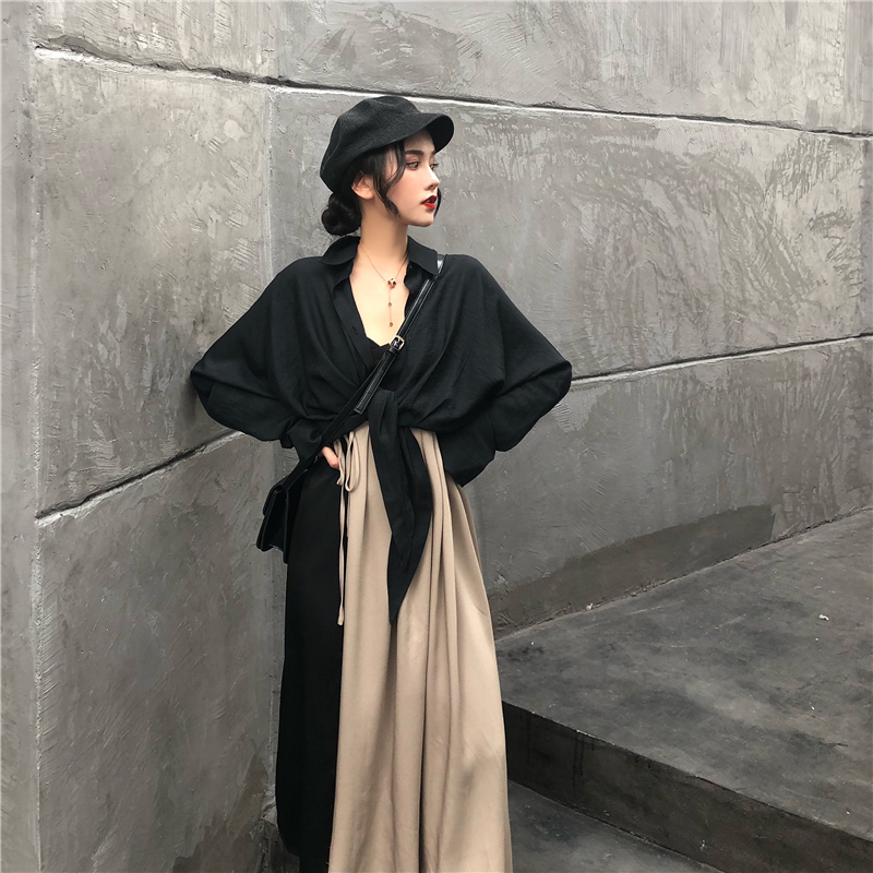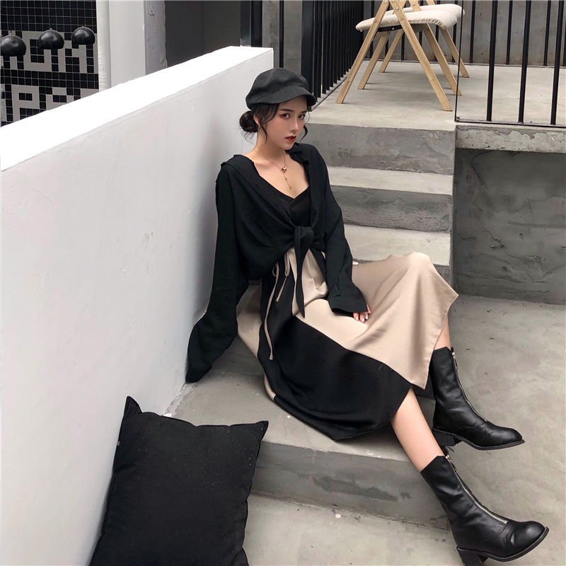 / 新款韓版時尚套裝早秋長袖黑色chic襯衫小香風吊帶連衣裙兩件套女