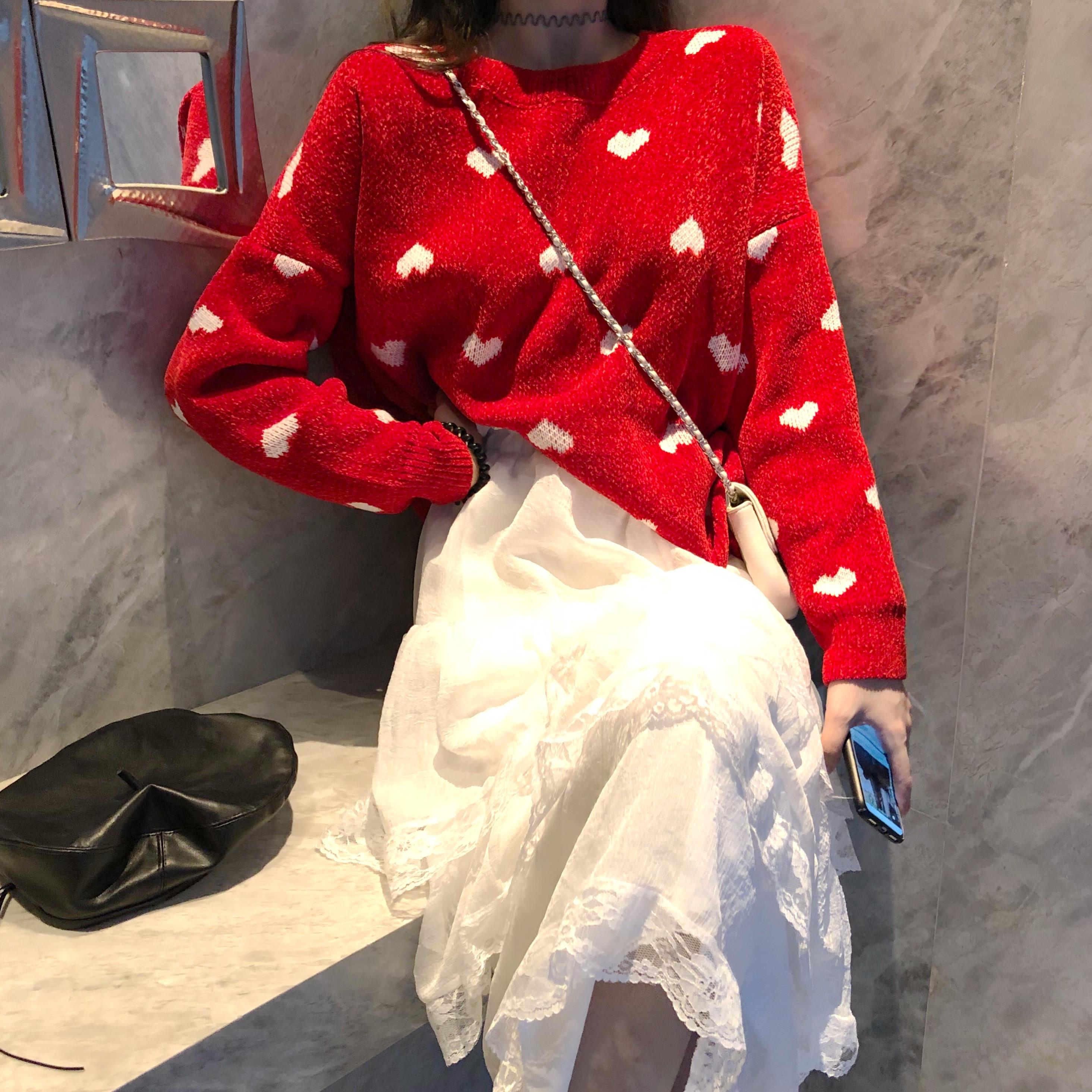 愛心毛衣白色|愛心毛衣紅色|蕾絲蛋糕裙|波點蛋糕裙