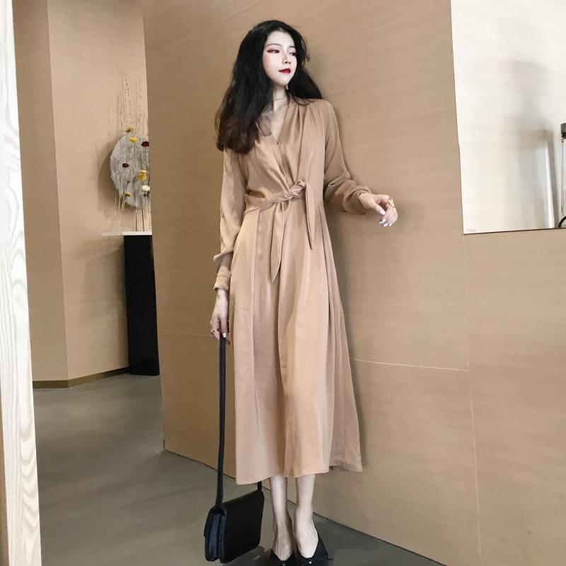 晚晚風2018新款秋季韓版女百搭時尚純色復古chic潮收腰連衣裙長裙