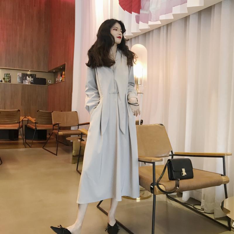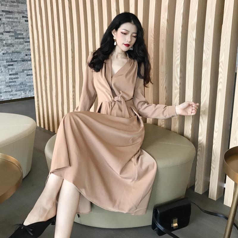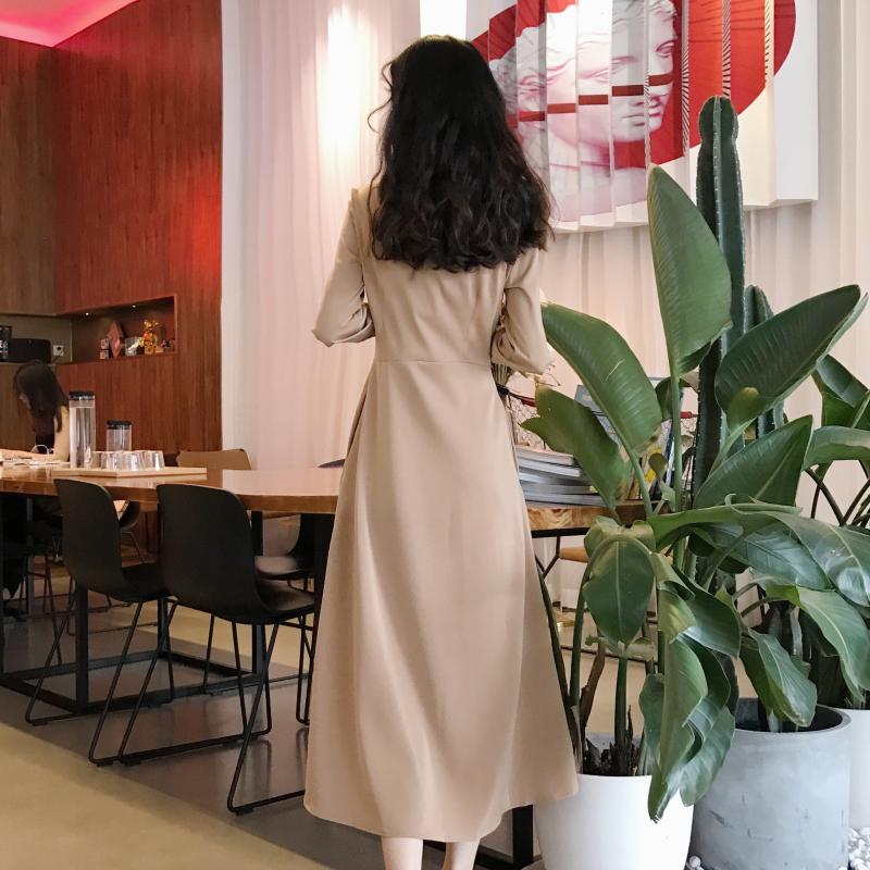 / 晚晚風2018新款秋季韓版女百搭時尚純色復古chic潮收腰連衣裙長裙
