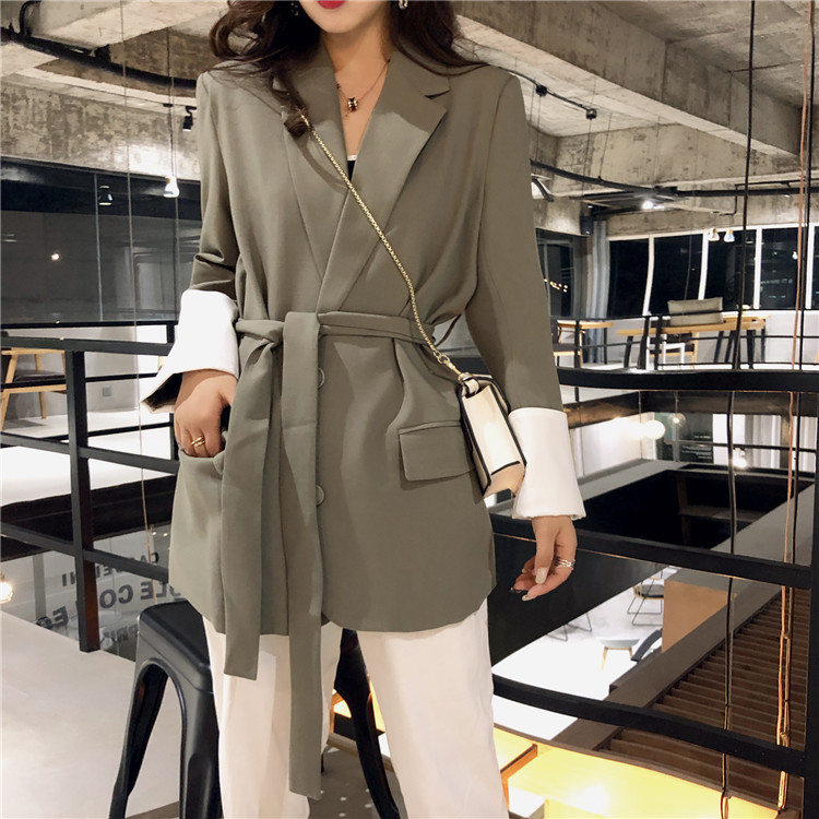小香風2018韓版時尚chic秋季新款氣質拼色系帶顯瘦純色西服領外套