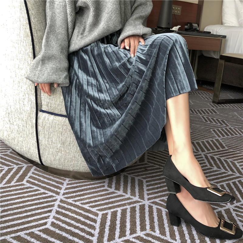 裙子女2018秋天復古港味中長款時尚修身百搭絲絨壓褶松緊腰半身裙