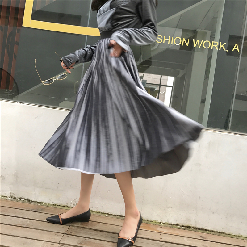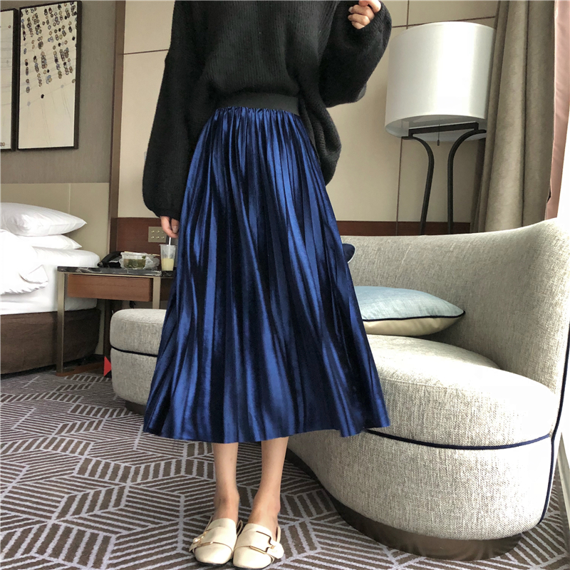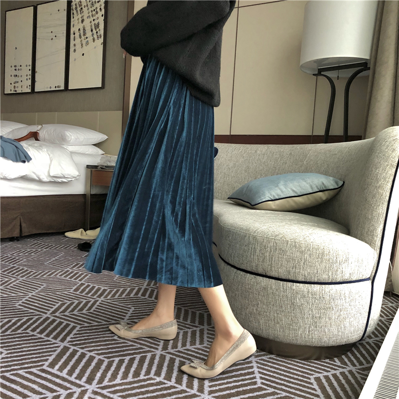 / 裙子女2018秋天復古港味中長款時尚修身百搭絲絨壓褶松緊腰半身裙