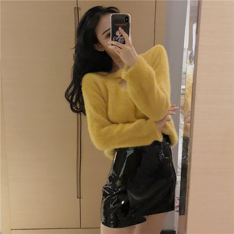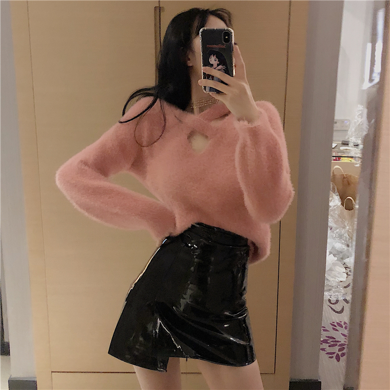 百搭韓版慵懶掛脖鏤空上衣時尚套裝高腰不規則PU皮裙小性感兩件套