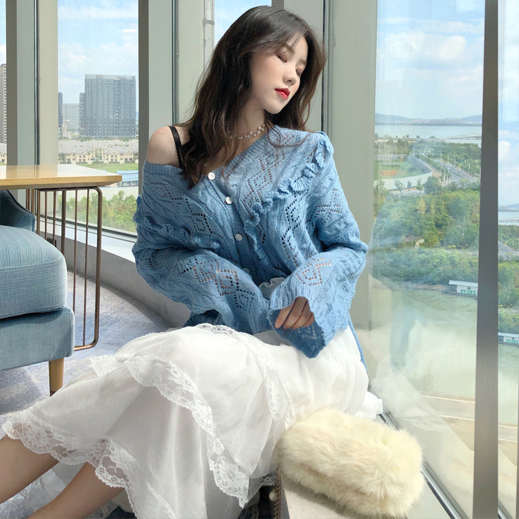 / 秋裝新款韓版木耳邊V領氣質毛衣超仙蕾絲蛋糕裙港風chic時尚套裝
