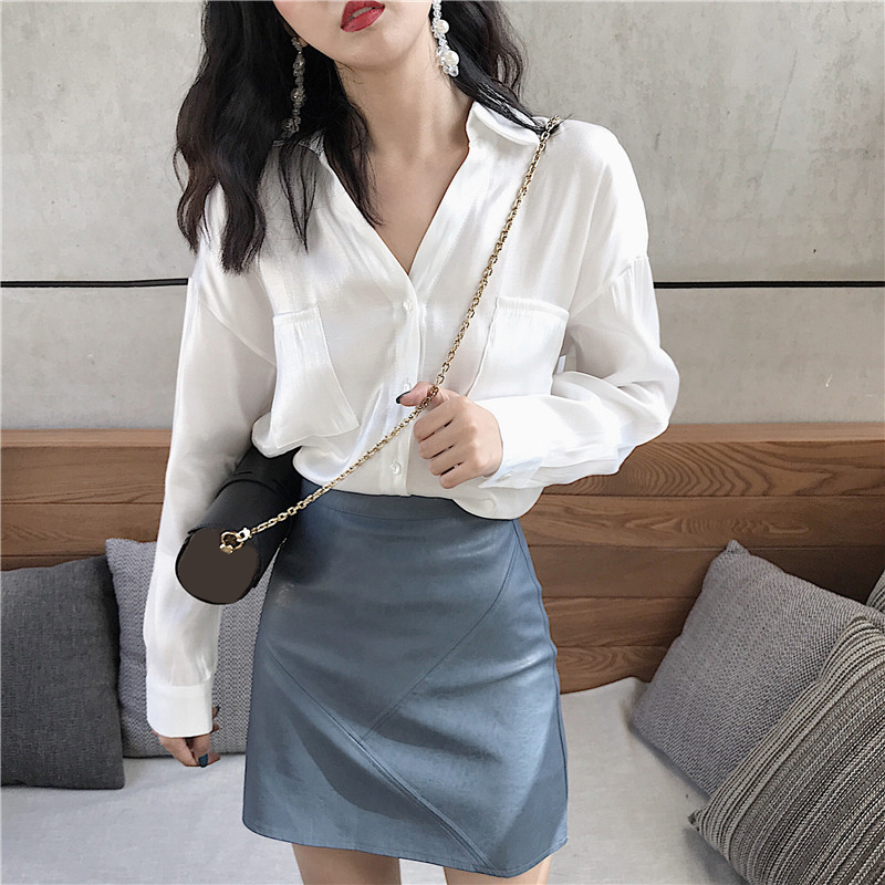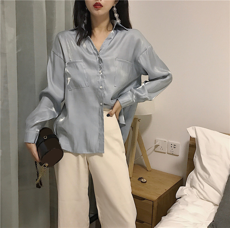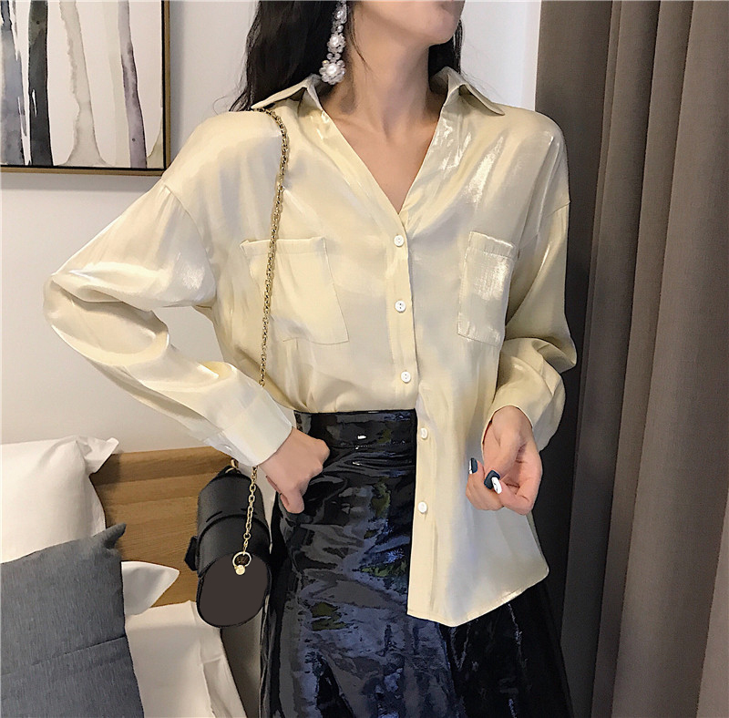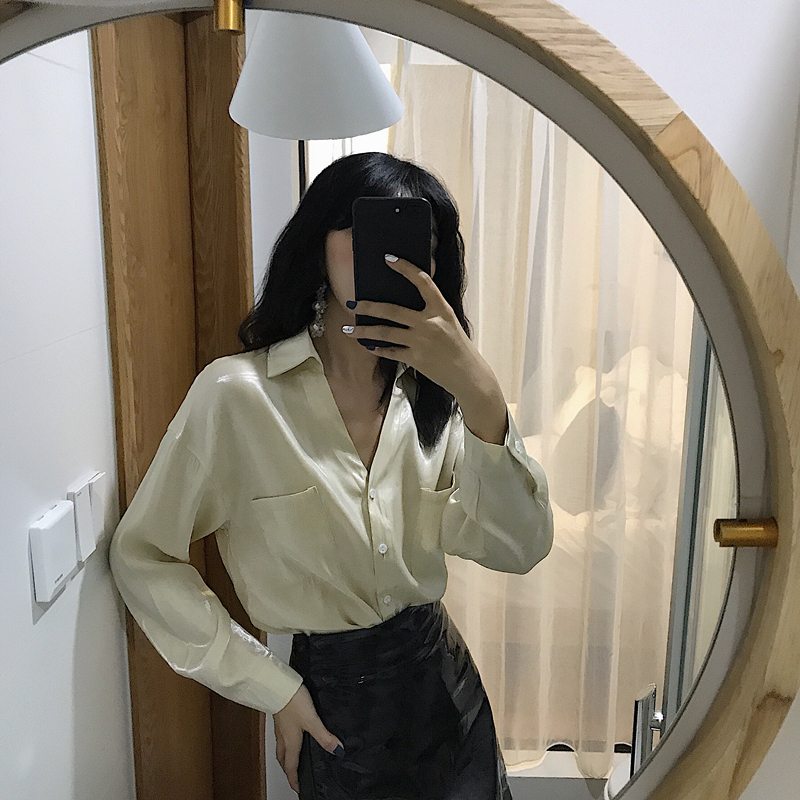 / 2018新款秋裝時尚百搭氣質上衣純色港風韓版寬松v領珠光長袖襯衫