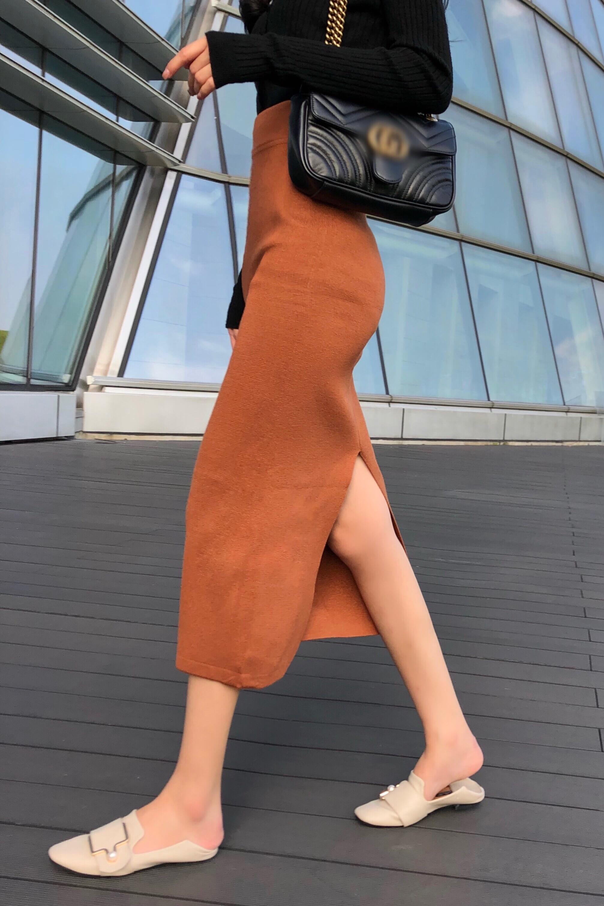 / 裙子女新款韓版chic秋天港味溫柔復古高腰開叉修身針織百搭半身裙