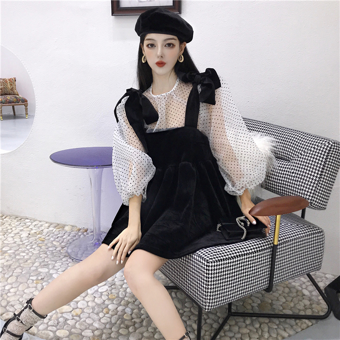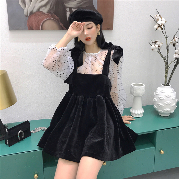 / 秋裝女2018新款套裝韓版波點長袖罩衫女+蝴蝶結絲絨吊帶裙兩件套