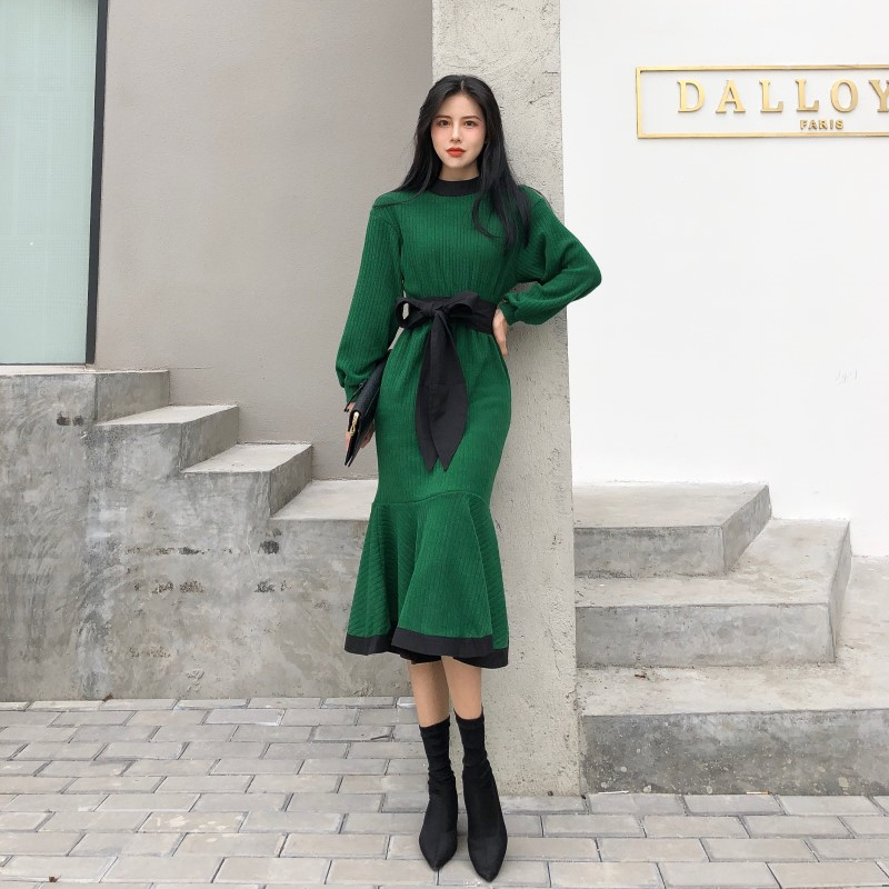 / 晚晚風新款韓版女時尚氣質百搭顯瘦中長款打底魚尾裙連衣裙配腰帶