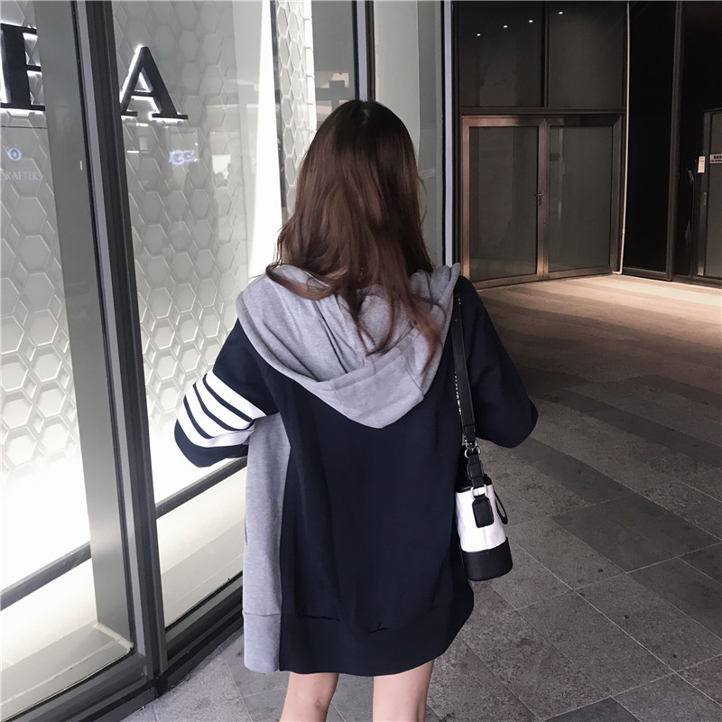 chic復古秋冬上衣慵懶衛衣女秋寬松拼色連帽休閑加絨拉鏈外套女潮