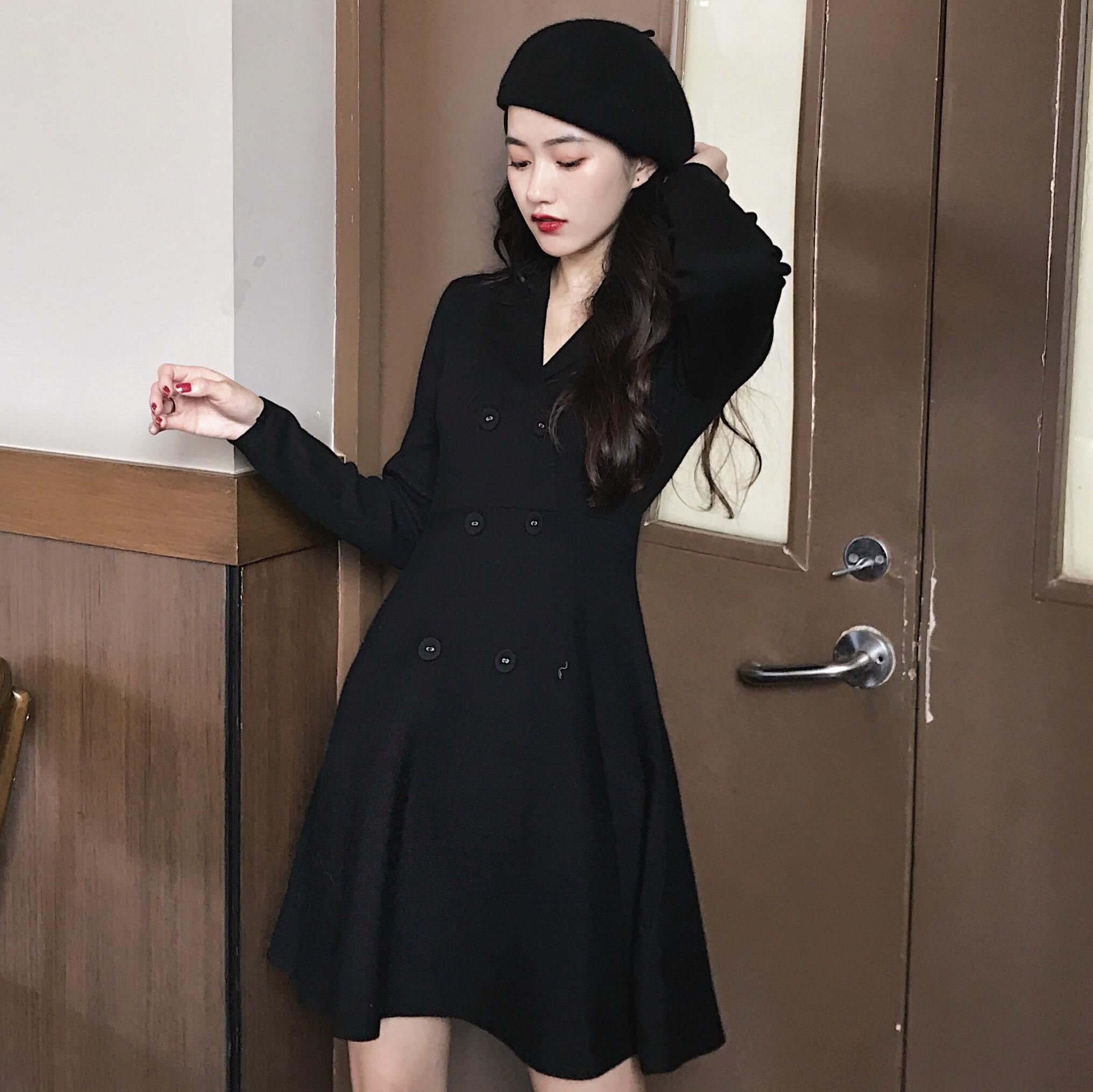 / 韓版百搭簡約氣質甜美修身顯瘦小翻領純色連身裙女裝秋冬2018新款