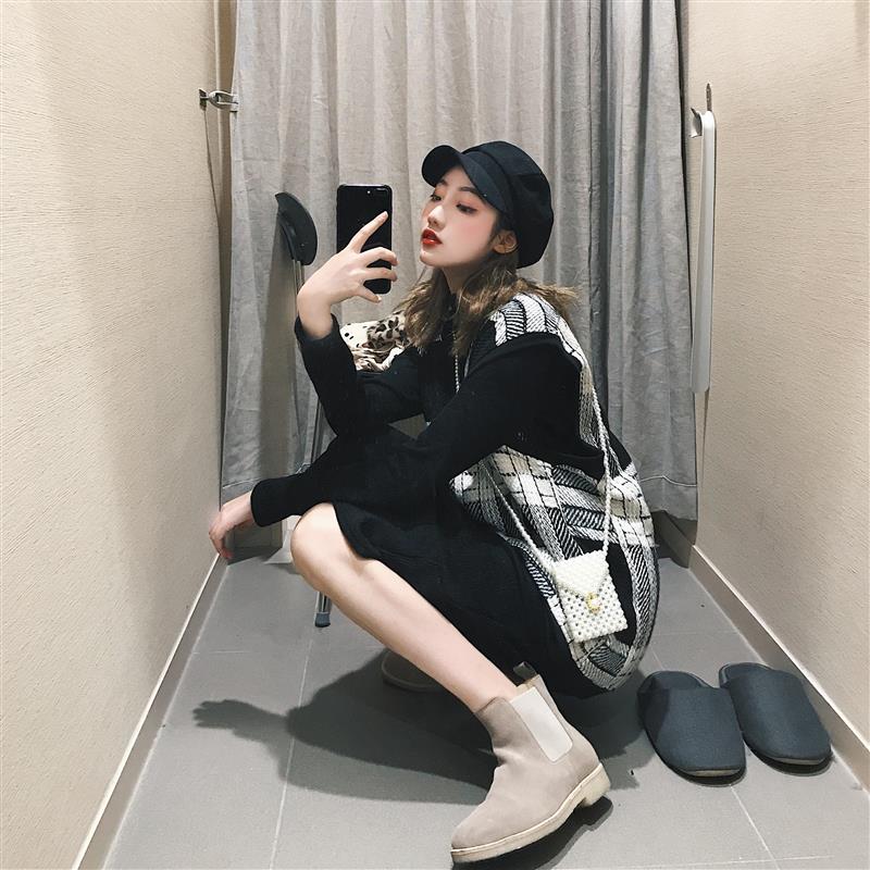 新款秋冬粗花呢V領寬松背心馬甲時尚套裝高領長袖打底裙兩件套潮
