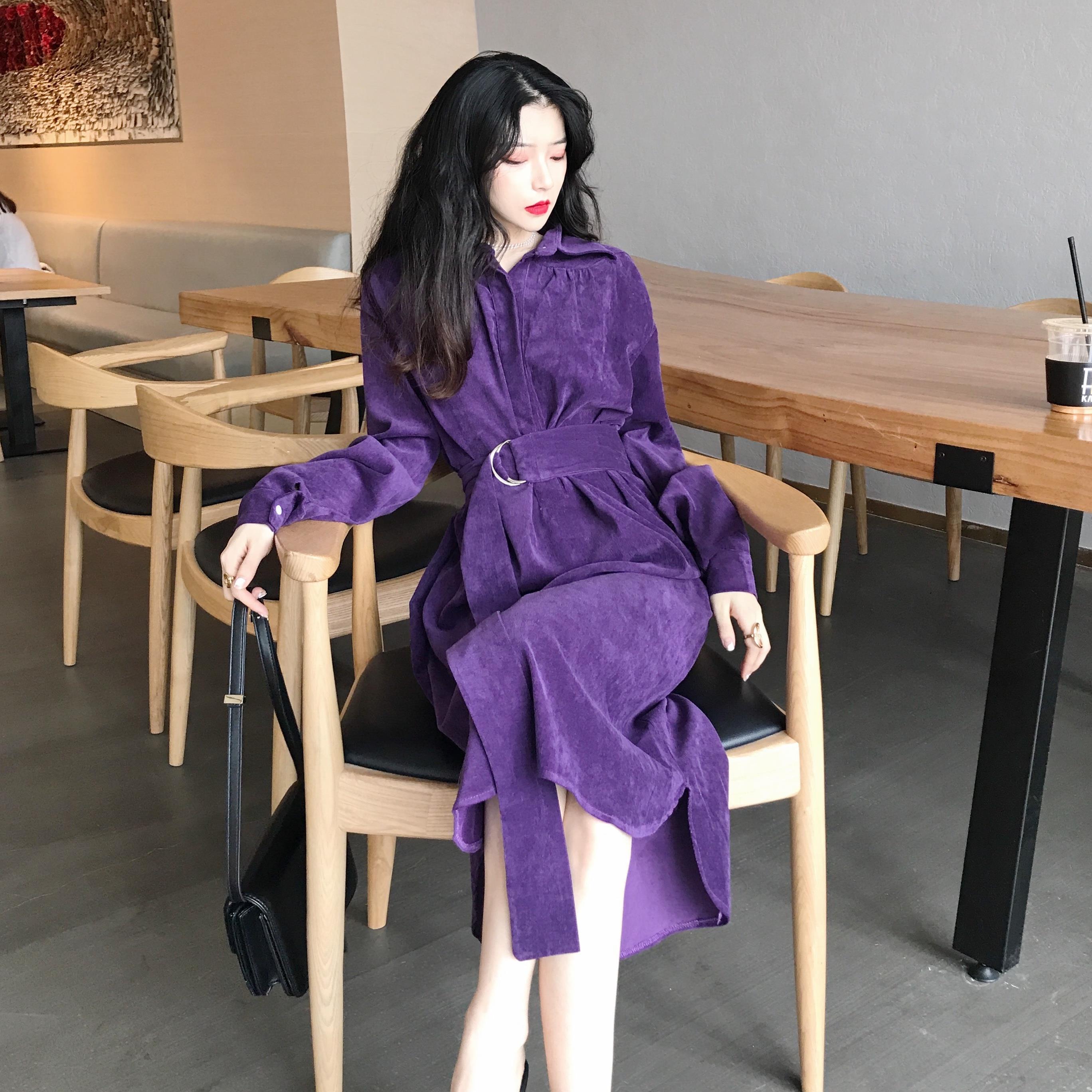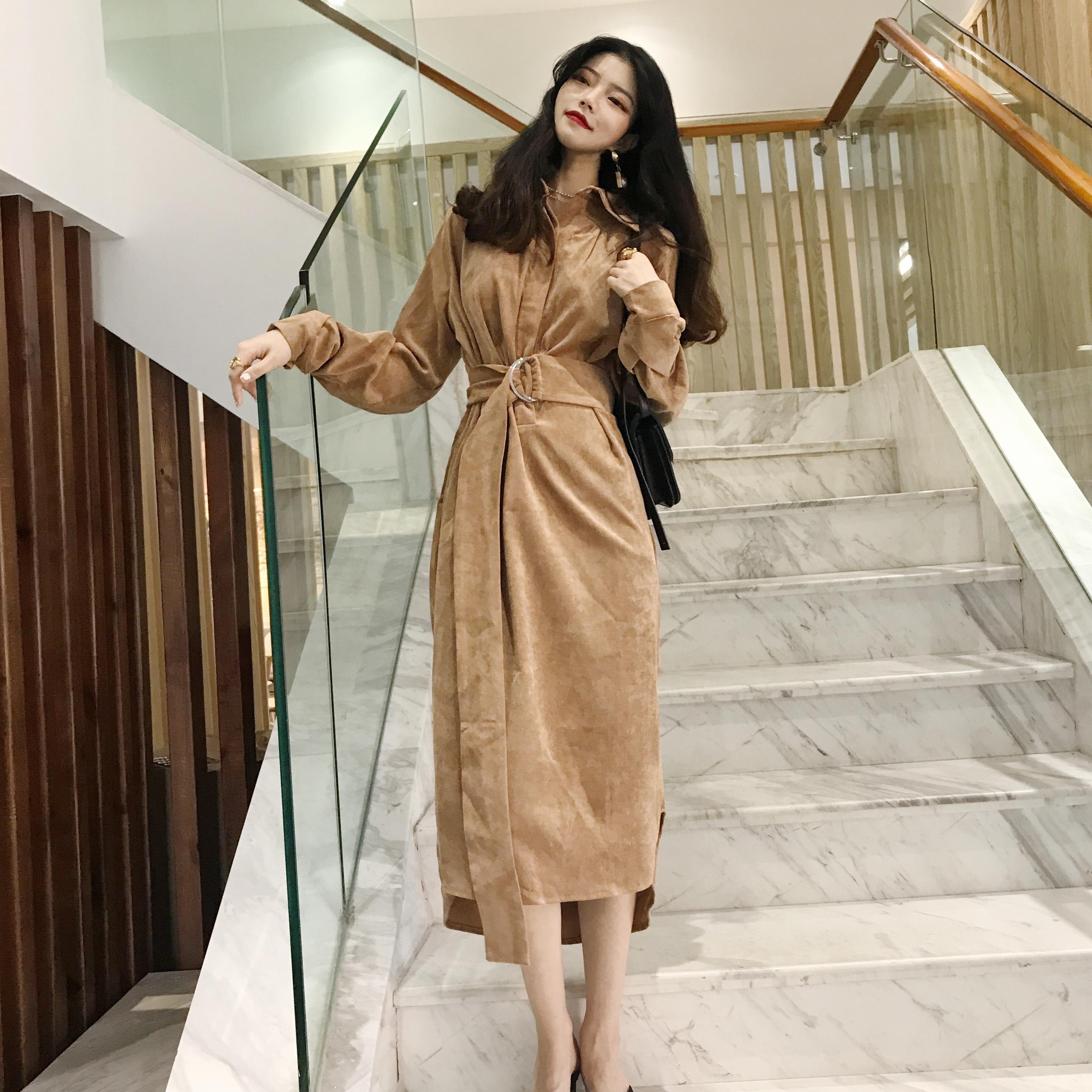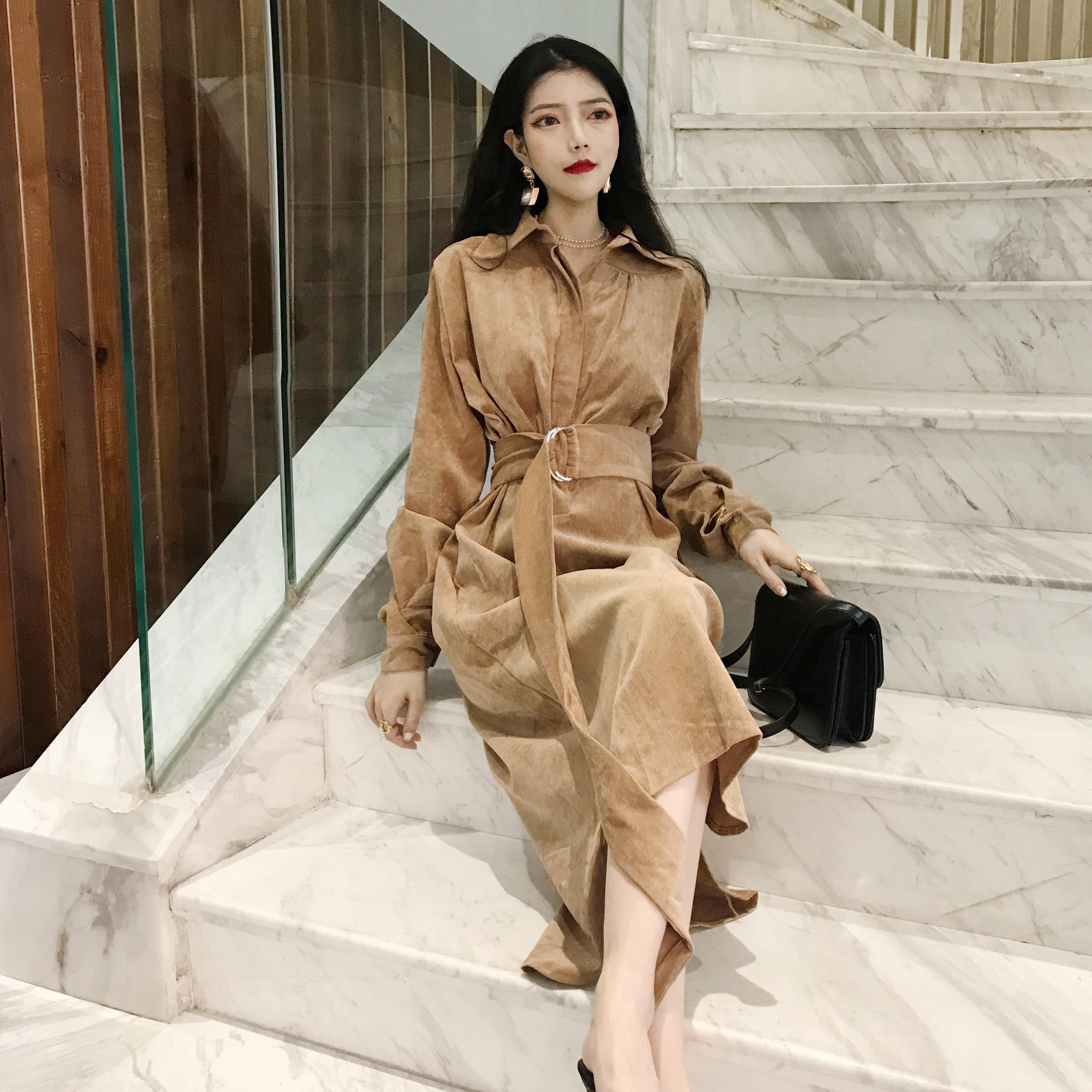 / 新款晚晚風時尚chic顯瘦V領露背氣質中長款金絲絨連衣裙女送腰帶