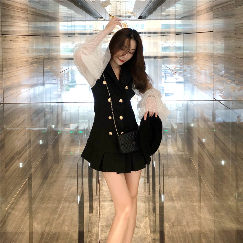 / 韓版修身顯瘦短裙chic氣質喇叭袖拼接雙排扣連衣裙秋裝2018新款女