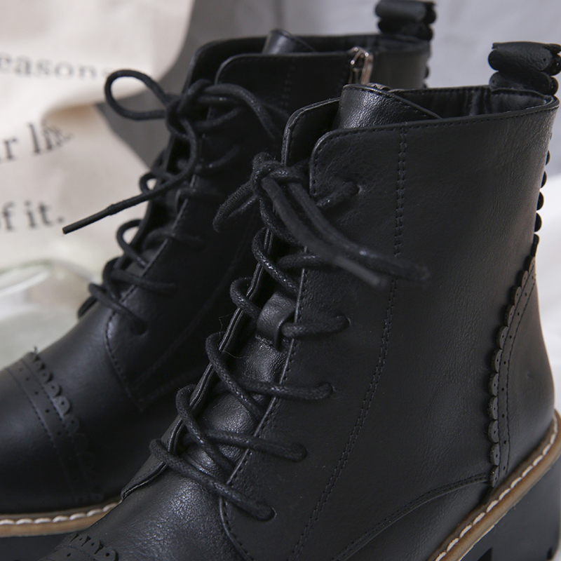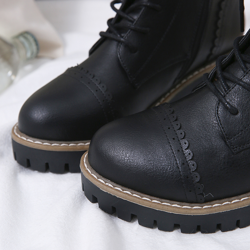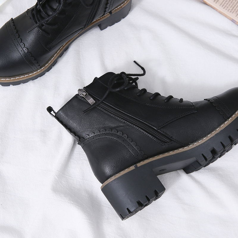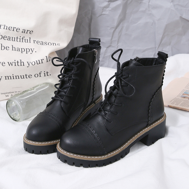 MG小象粗跟系帶馬丁靴女韓版學生休閑短靴2018新款方跟圓頭鞋子潮