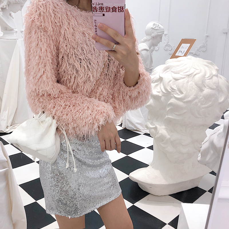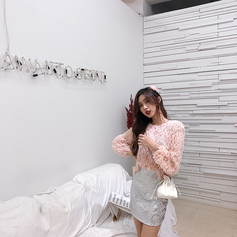 流蘇毛毛長袖寬松圓領百搭套頭針織衫+韓版亮面高腰包臀裙半身裙