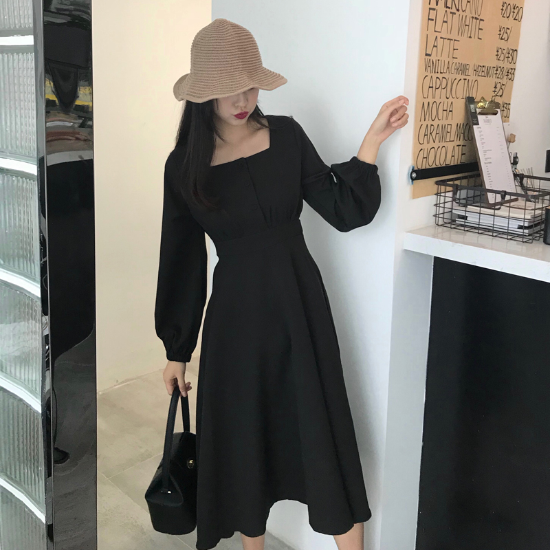 / 2018新款韓范復古百搭時尚中長款收腰長袖連衣裙方領燈籠袖A字裙
