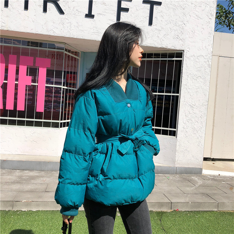 / 2018冬季chic綁帶收腰顯瘦V領百搭復古加厚保暖棉服女面包服外套