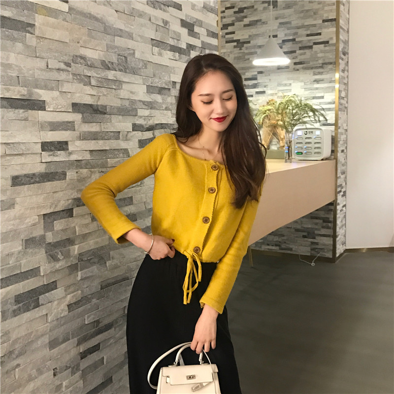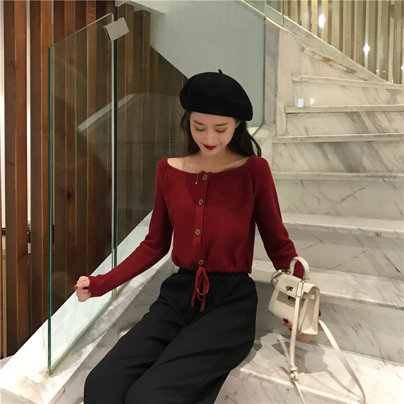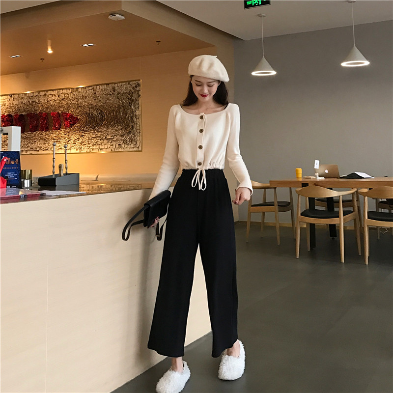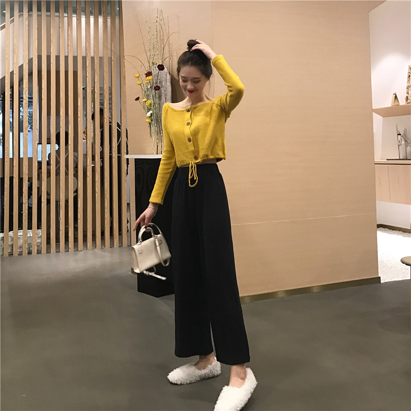 韓版復古風寬松系帶針織開衫短外套時尚套裝高腰顯瘦闊腿褲兩件套