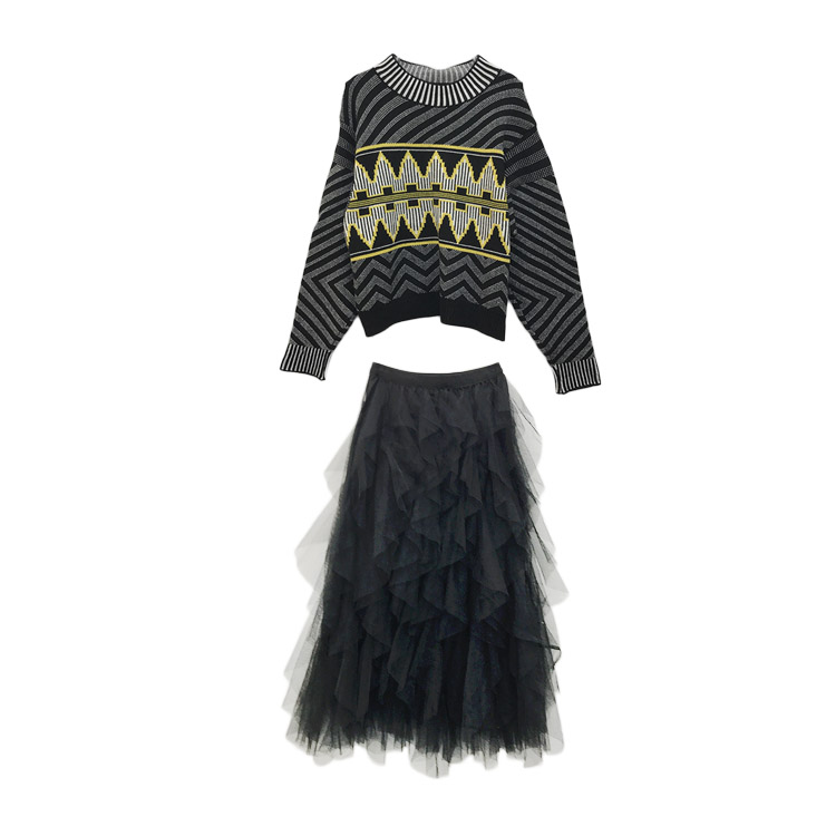女神套裝秋冬新款幾何圖案毛衣+層層網紗半身裙仙女裙時尚兩件套