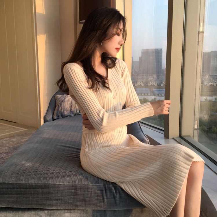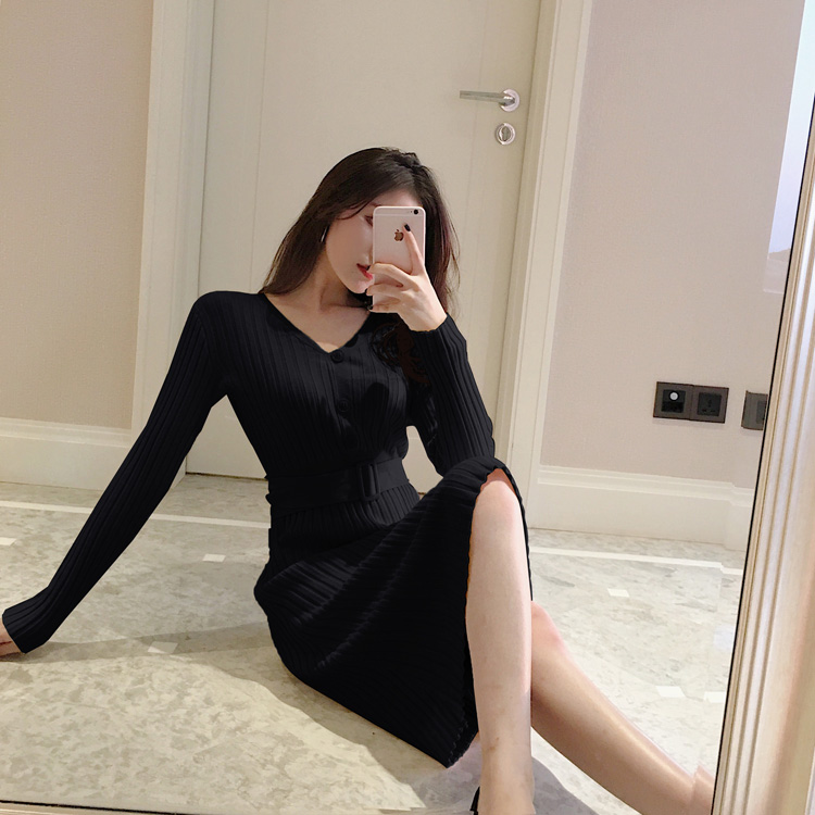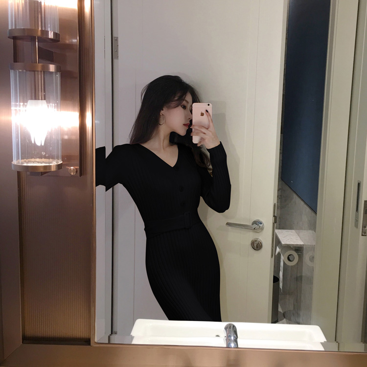 / 時尚包臀裙氣質V領高腰長袖純色包芯紗針織連衣裙女秋冬2018新款
